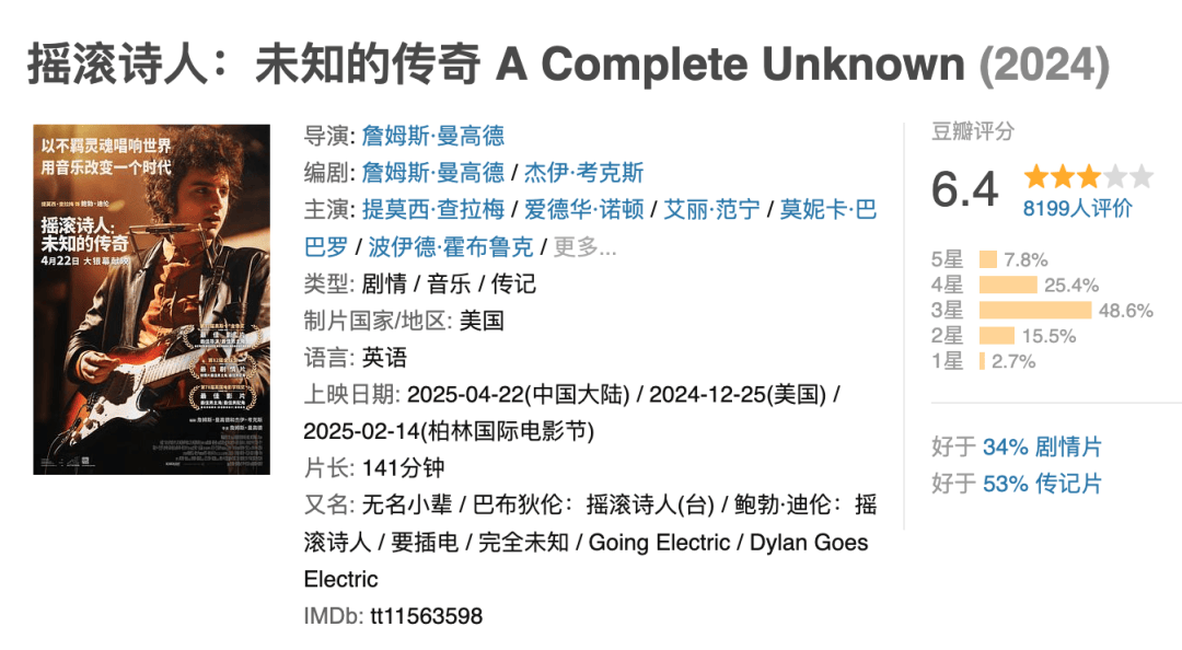 本片也是去年颁奖季的热门文艺片了,奥斯卡拿到8项提名(虽然颗粒无收),不过,冲着鲍勃迪伦,或是主演甜茶,应该有朋友还是感兴趣吧。