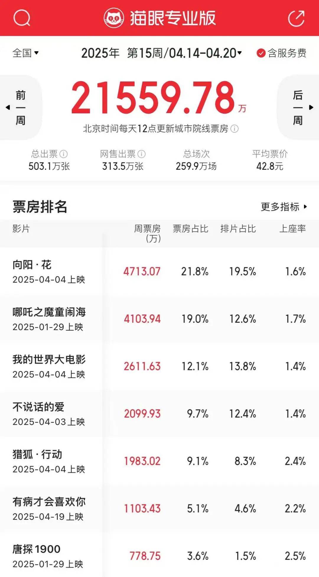 同时,上周的整体院线片状况也非常一般。上周院线所有影片的总票房也才2.15亿,属实是有点低了。