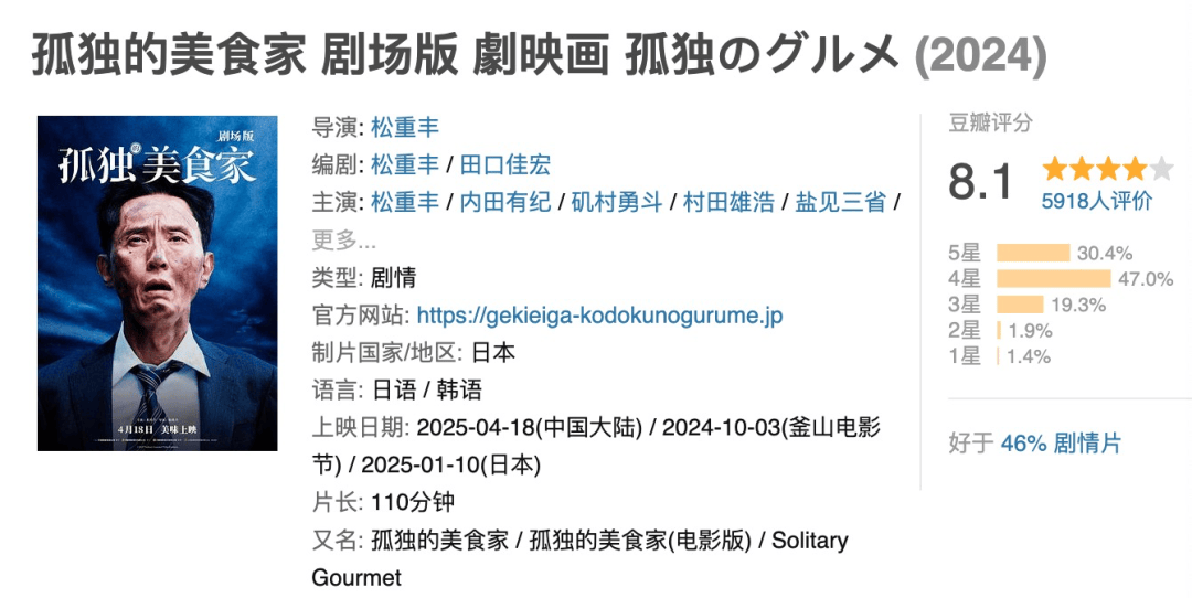 但是,借助当初TV出色的人气和口碑,以及五郎的个人魅力,这部剧场版还是吸引了不少关注,豆瓣评分也不错,现在也有8.1分,感兴趣也是可以看看的。