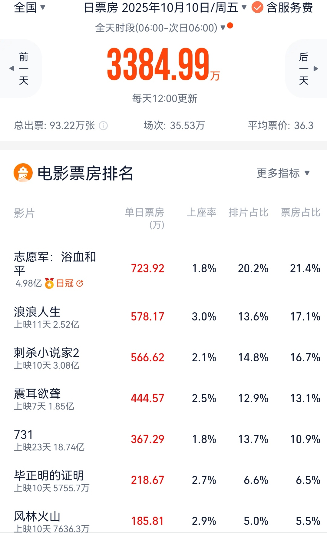 工作日大盘降温,《志愿军:浴血和平》单日票房724万元,仍是日冠,上座率只有1.8%,平台预计其最终总票房可能落在6亿元上下。