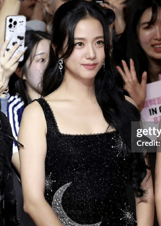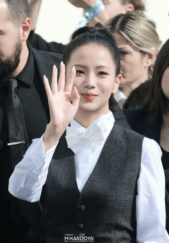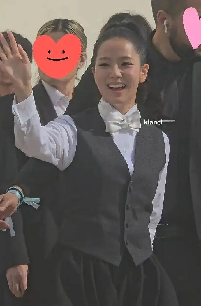 10月1日巴黎大秀现场,金智秀未穿绿裙,而是以白色缎面衬衫+黑色高腰阔腿裤+大光明高马尾造型亮相,她由迪奥全球公关总监牵手入场,因此她没穿绿色长裙,让很多粉丝表示失望。
