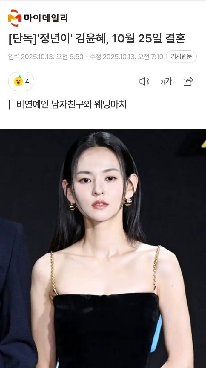 据悉,金允慧的未婚夫并非演艺圈人士,而是从事艺术相关工作的普通人,两人经朋友介绍相识,经过两年多的相处后确定结婚意向。此前虽有媒体拍到金允慧与神秘男子一同逛超市、看展览,但她始终未回应感情传闻,此次直接官宣婚讯,既符合她一贯 “低调不炒作” 的行事风格,也给了粉丝一份突如其来的惊喜。有知情人士透露,金允慧在筹备婚礼期间,几乎全程亲力亲为,从喜帖设计到现场布置,都融入了两人的共同喜好,“她希望婚礼上的每一个细节都带着专属记忆,比如喜帖上会印上两人一起画的小图案,现场装饰也以双方都喜欢的浅色系为主,营造出像家一样温暖的感觉”。
