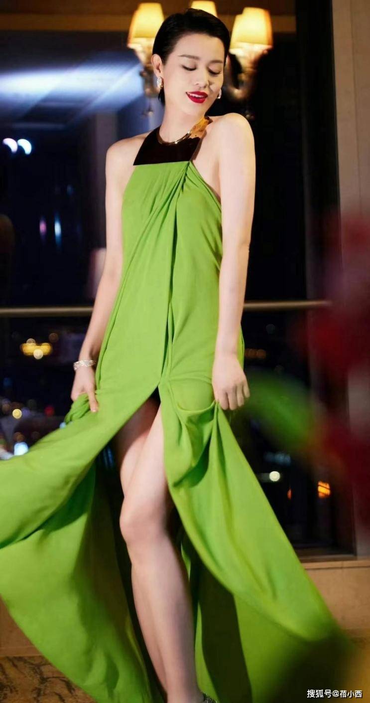 绿裙是开叉设计,位置从大腿开始,这样一来,女性在穿时一定要配件安全裤。