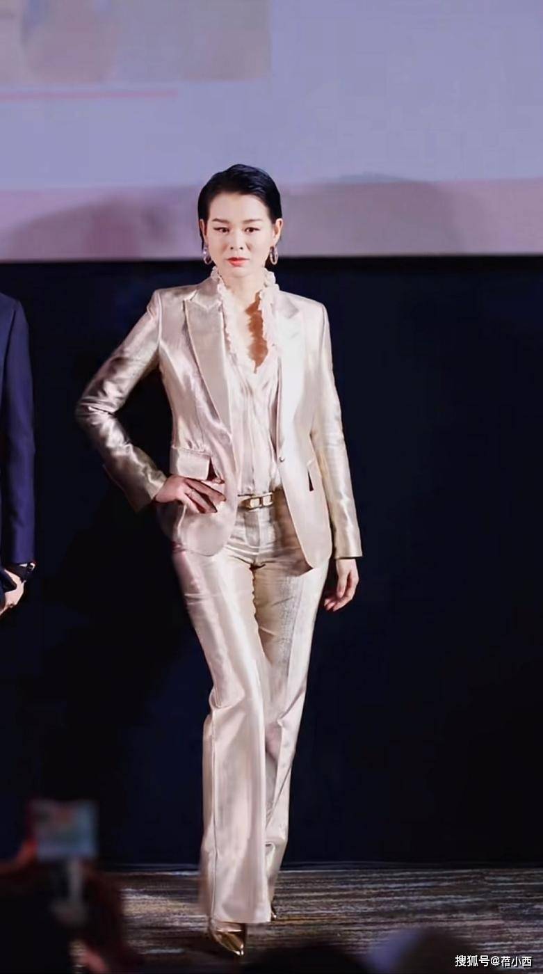 这身香槟金色西服套装太抢眼了,先来说说内搭,荷叶边衬衫衬得人优雅大气。为了显得人更高,穿着者基本会将衬衫衣摆塞裤腰。
