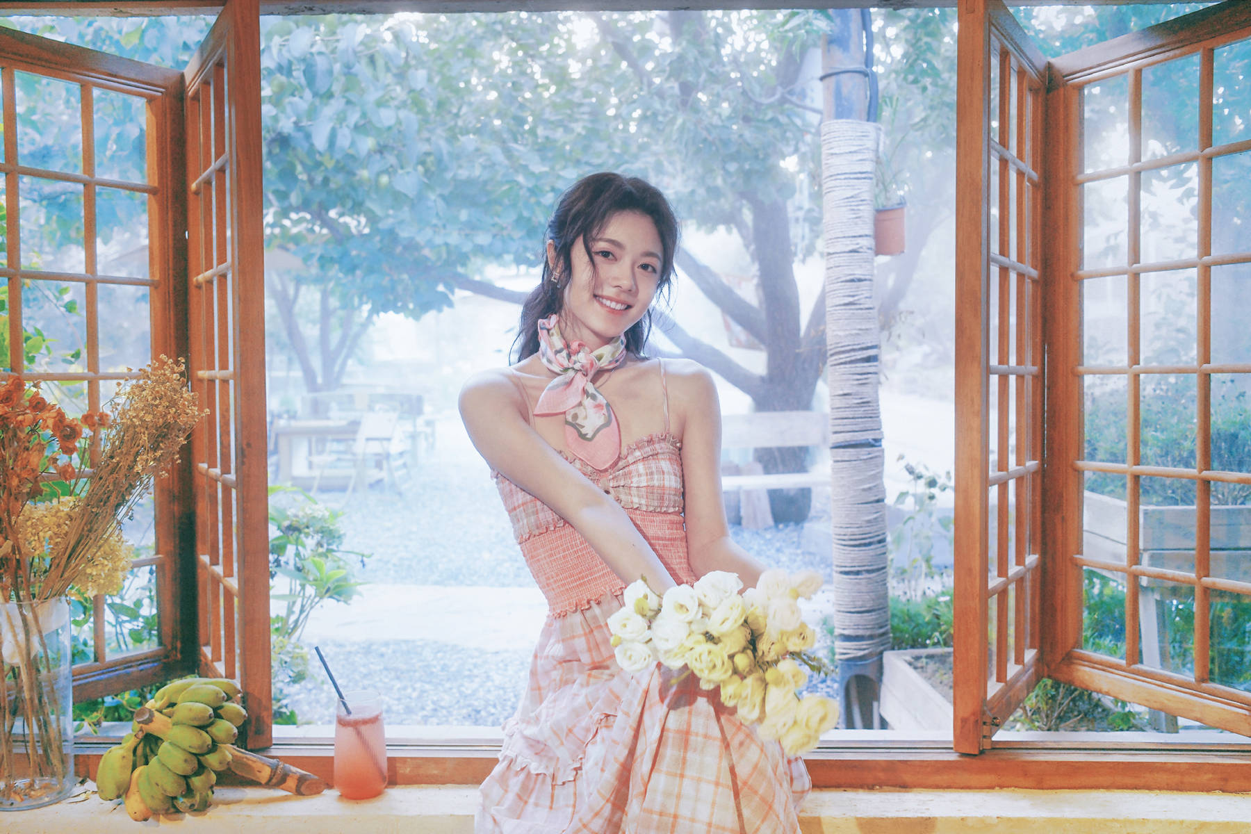 在这组写真中,赵今麦的姿态和表情丰富多样。她时而微微歪着头,嘴角扬起一个甜甜的笑容,眼睛弯成了月牙状,露出两颗小小的梨涡,显得格外可爱。时而双手背在身后,身体微微前倾,眼神好奇地打量着周围的一切,像个对世界充满探索欲的孩子。时而坐在咖啡馆外的木质长椅上,双腿并拢,双手轻轻放在膝盖上,眼神望向远方,带着一丝淡淡的憧憬与向往,给人一种安静美好的感觉。