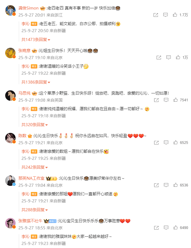 马思纯留言送祝福:“这个草原小野猫,生日快乐呀!绽放吧,奔跑吧,亲爱的沁沁,一切如愿!”