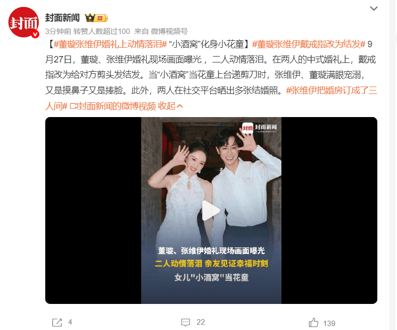 9 月 27 日,演员董璇与张维伊的中式婚礼现场画面正式曝光,一组充满传统仪式感与温情细节的照片迅速刷屏社交平台。婚礼以 “中式传统” 为核心基调,不仅将交换戒指的环节创新改为 “剪发结发” 的古典礼仪,董璇与张维伊在仪式中更动情落泪,尽显对彼此的珍视;而董璇女儿 “小酒窝” 以花童身份上台递剪刀时,夫妻二人满眼宠溺的互动 —— 摸鼻子、捧脸颊的温柔动作,更是将现场氛围推向温馨高潮。此外,两人还同步在社交平台晒出多张甜蜜结婚照,配文 “执子之手,与子偕老”,正式宣告开启婚姻新篇章。