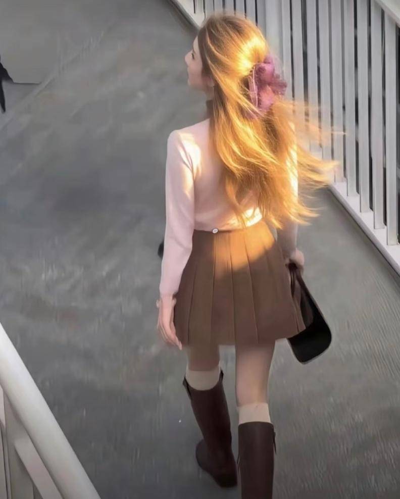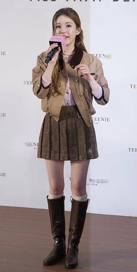 活动现场赵露思身穿一条咖色格纹短裙,内搭一件淡粉色长衫,配一件卡其色夹克衫,脚踩一双高筒靴,整体造型非常学院风。