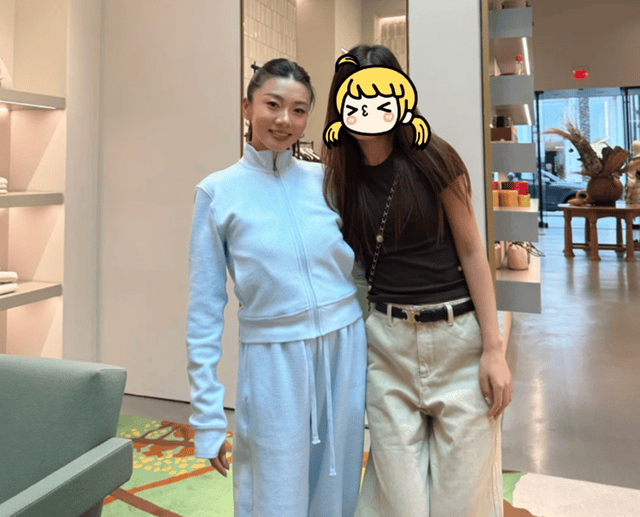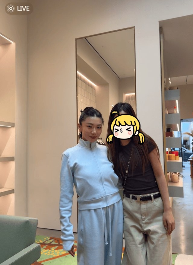 偶遇照中,程晓玥扎着马尾辫,身穿浅蓝色运动套装,化着精致的妆容,与女粉丝合影时的她亲切贴贴,嘴角微微上扬露出甜美笑容,亲和力满分。