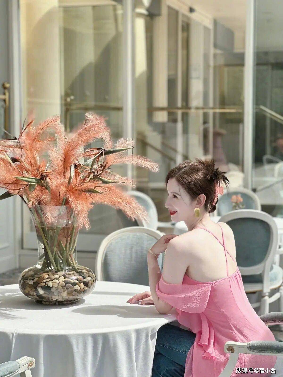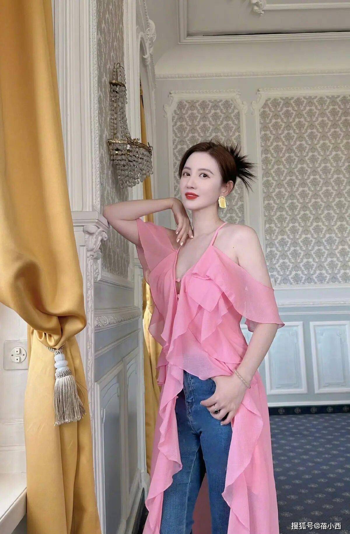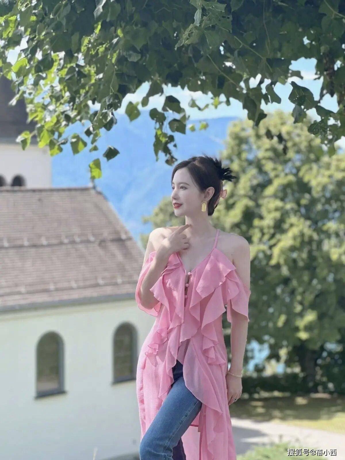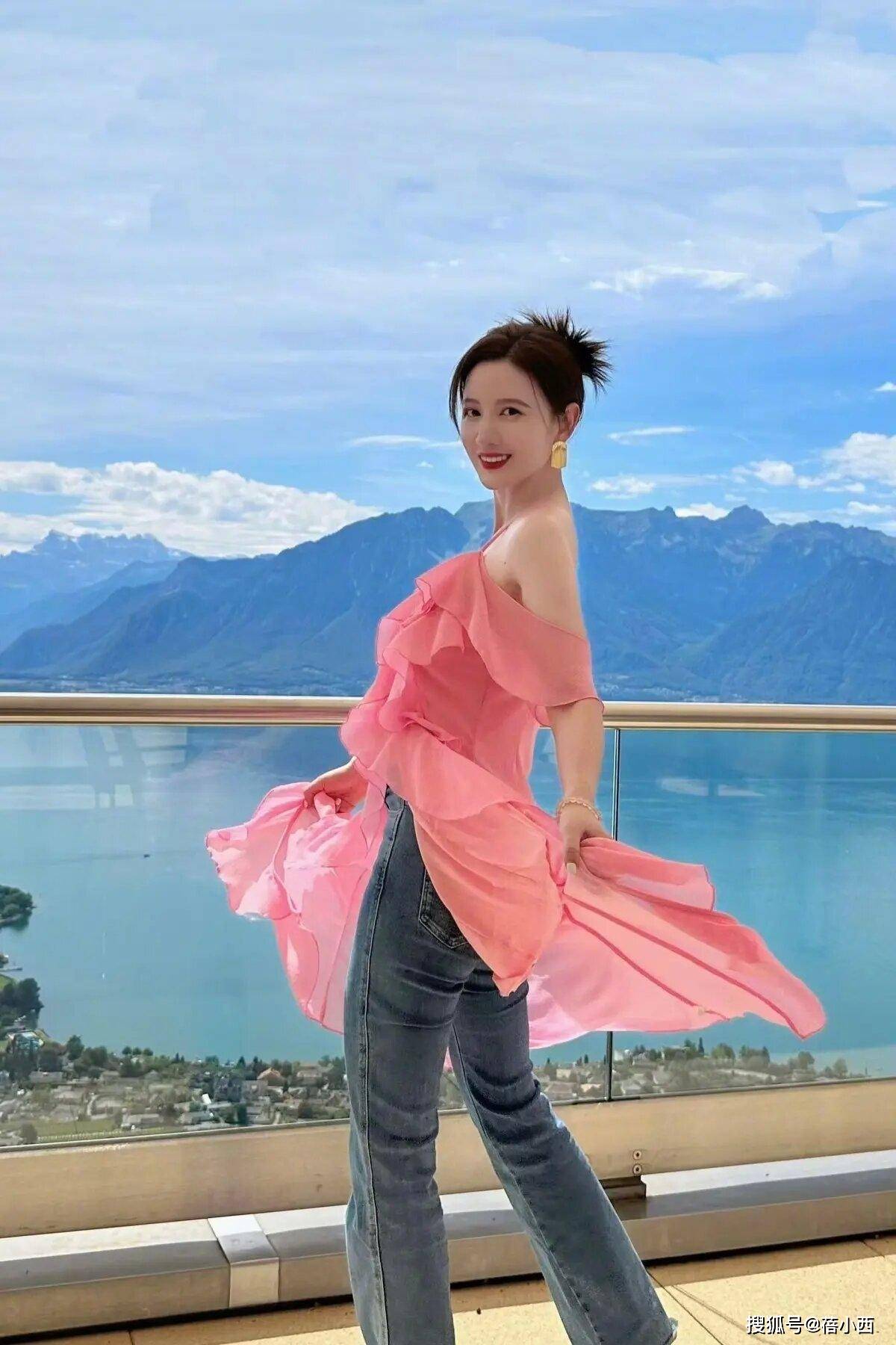 张萌的穿搭很有巧思,上身是一件粉色吊带衫,面料轻薄似轻纱,荷叶边的设计随着动作轻轻摆动,既增添了柔美的氛围感,又透着几分灵动俏皮,吊带的款式还能很好地展现肩颈线条,凸显出优雅气质。下装搭配的是蓝色牛仔喇叭裤,复古的牛仔材质与喇叭裤型相结合,带着浓浓的时尚复古感,宽松的裤型又能营造出随性自在的氛围。整体来看,粉色上衣的柔美和牛仔喇叭裤的率性相互平衡,在山水景色的映衬下,更显清新又不失个性。