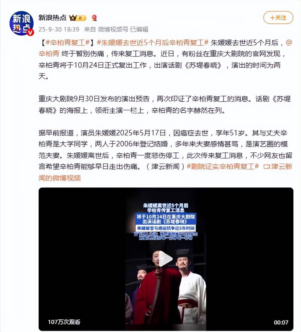 时隔近五个月,演员辛柏青的名字再次出现在公众视野——这一次,是在重庆大剧院的话剧海报上。这位在妻子朱媛媛去世后几乎从人间蒸发的男人,终于要重返舞台了。