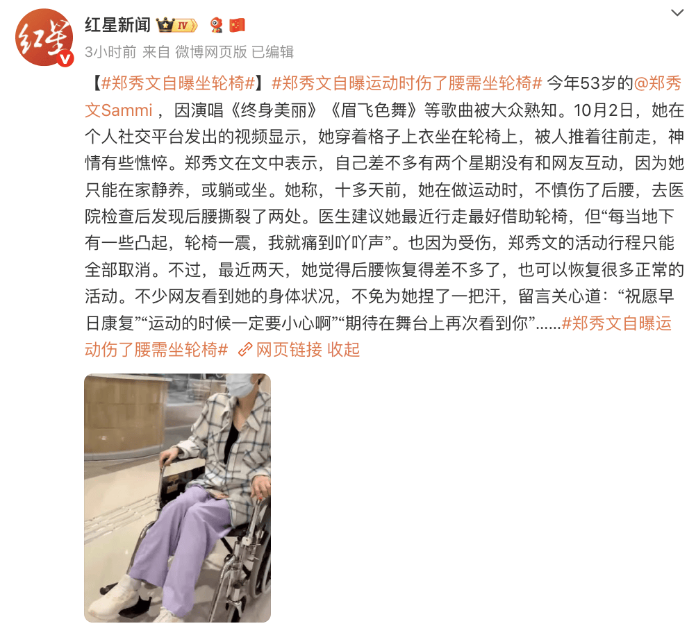 今年53岁的郑秀文,因演唱《终身美丽》《眉飞色舞》等歌曲被大众熟知。10月2日,她在个人社交平台发出的视频显示,她穿着格子上衣坐在轮椅上,被人推着往前走,神情有些憔悴。