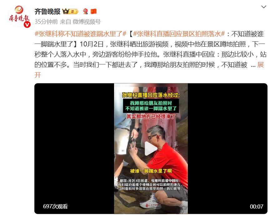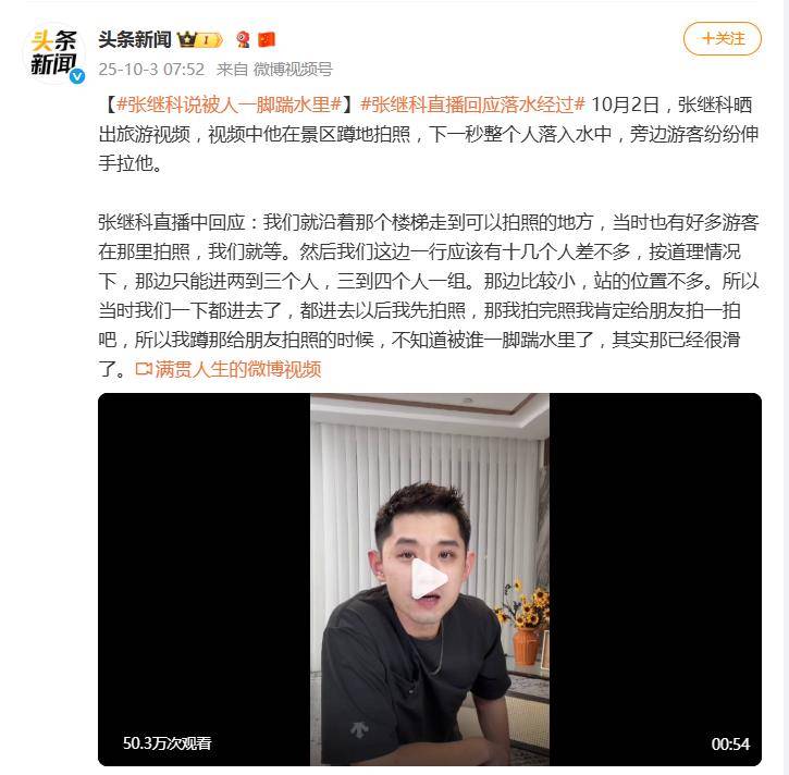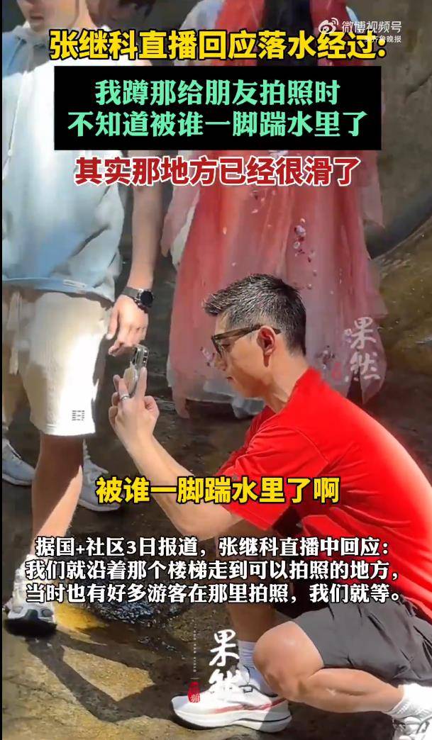事件发酵后,10月3日,有媒体报道,张继科本人在直播中哭笑不得地回应:“那边比较小,站的位置不多,我们一行十几个人都挤进去了。我蹲那儿给朋友拍照的时候,不知道被谁一脚踹水里了!”他进一步解释,当时地面青苔覆盖,非常湿滑,后方有游客不慎滑倒撞到他,才导致了这场意外。