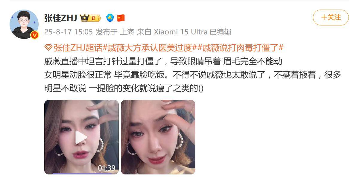 更何况,戚薇在“真实”这条路上,早就走得很远。2025年8月,她曾在直播里坦然演示自己因肉毒素注射超标40%,导致“眉毛动不了、眼睛变吊梢”的状况。对比内娱普遍对医美遮遮掩掩的风气,她这种大方自曝的态度,反而被网友称赞“推动行业透明化”。