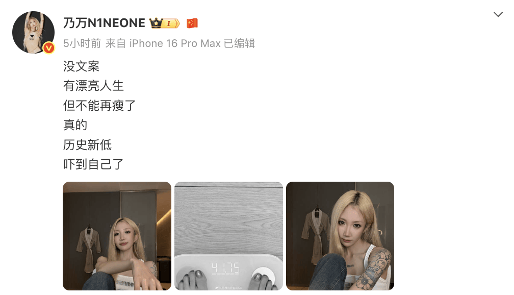 4日,乃万在社交平台上发文透露自己瘦到不足42kg,她表示:“没文案,有漂亮人生,但不能再瘦了,真的,历史新低,吓到自己了。”乃万还晒出体重秤显示为41.75kg的照片。