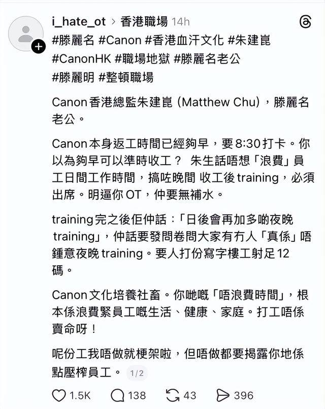 据悉滕丽名的丈夫朱建昆,任职于一家日资公司,他在该公司中担任总监一职。近日,一名匿名自称是朱建昆下属的网民,在网上点名控诉朱建昆压榨员工。