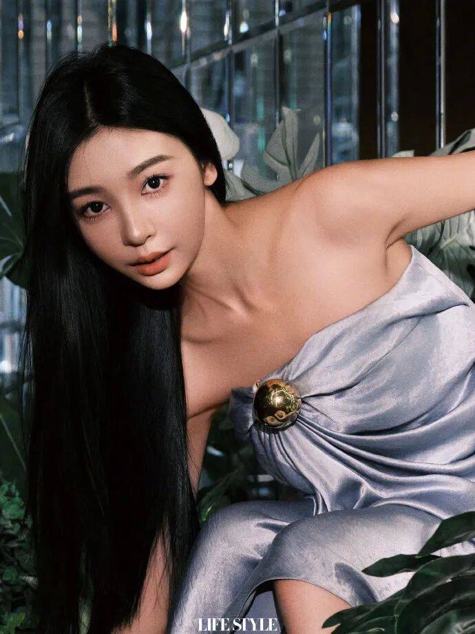 换上银色抹胸裙的易梦玲,她俏脸成熟妩媚,明眸善睐,烈焰红唇,乌黑的长发飘逸,露出白皙的香肩和手臂,这位美女俯身弯腰的样子,既风情万种,又性感火辣!