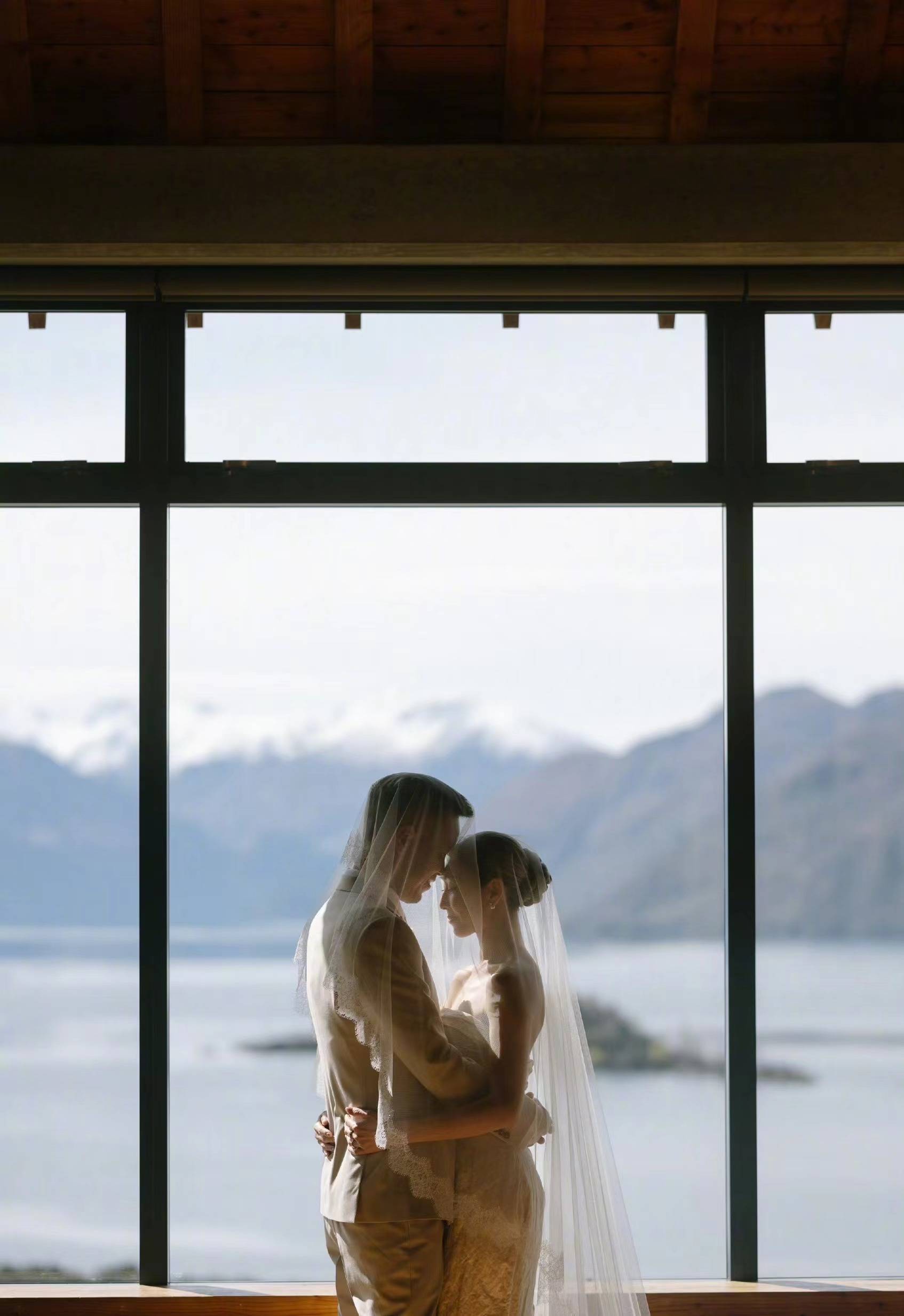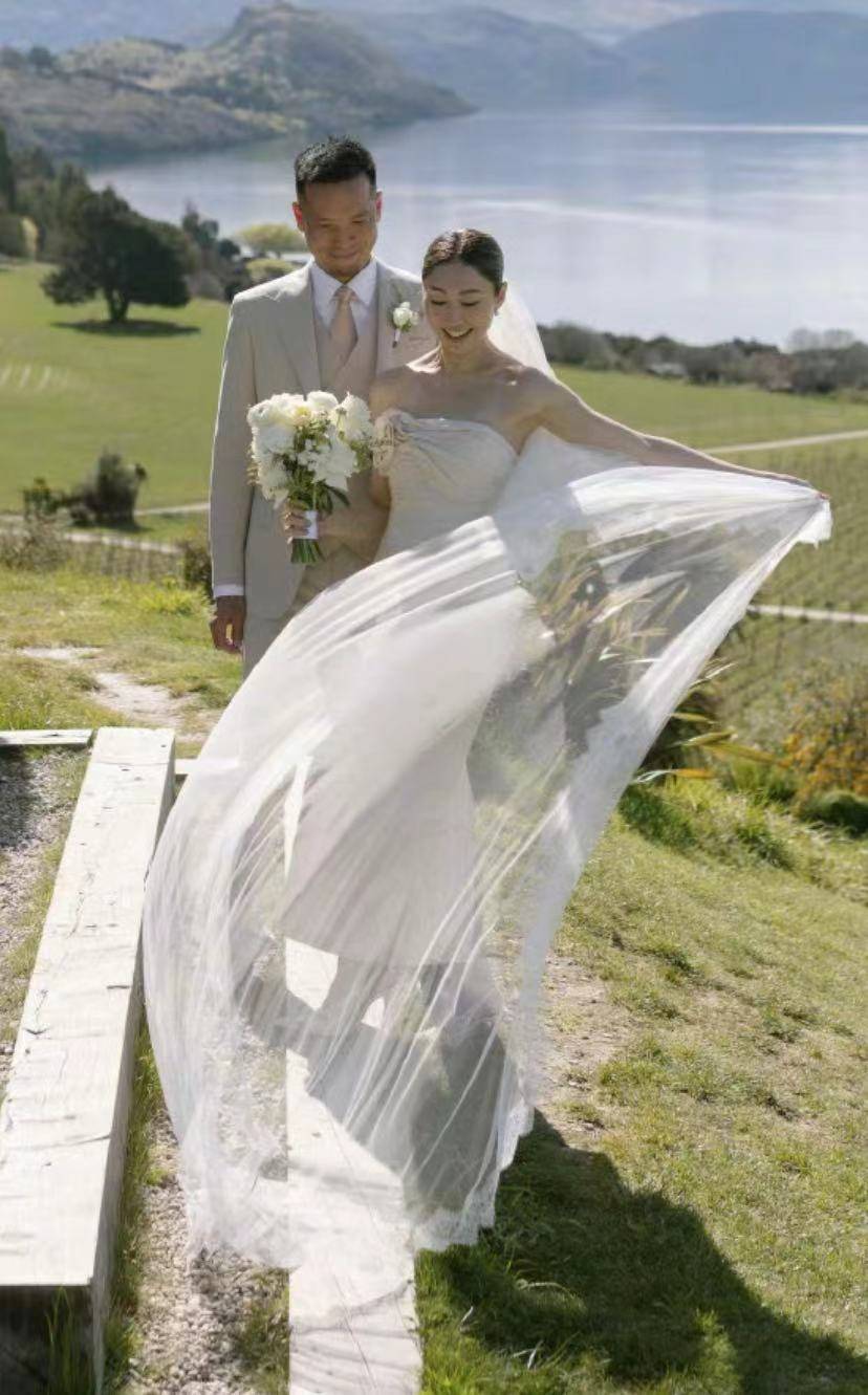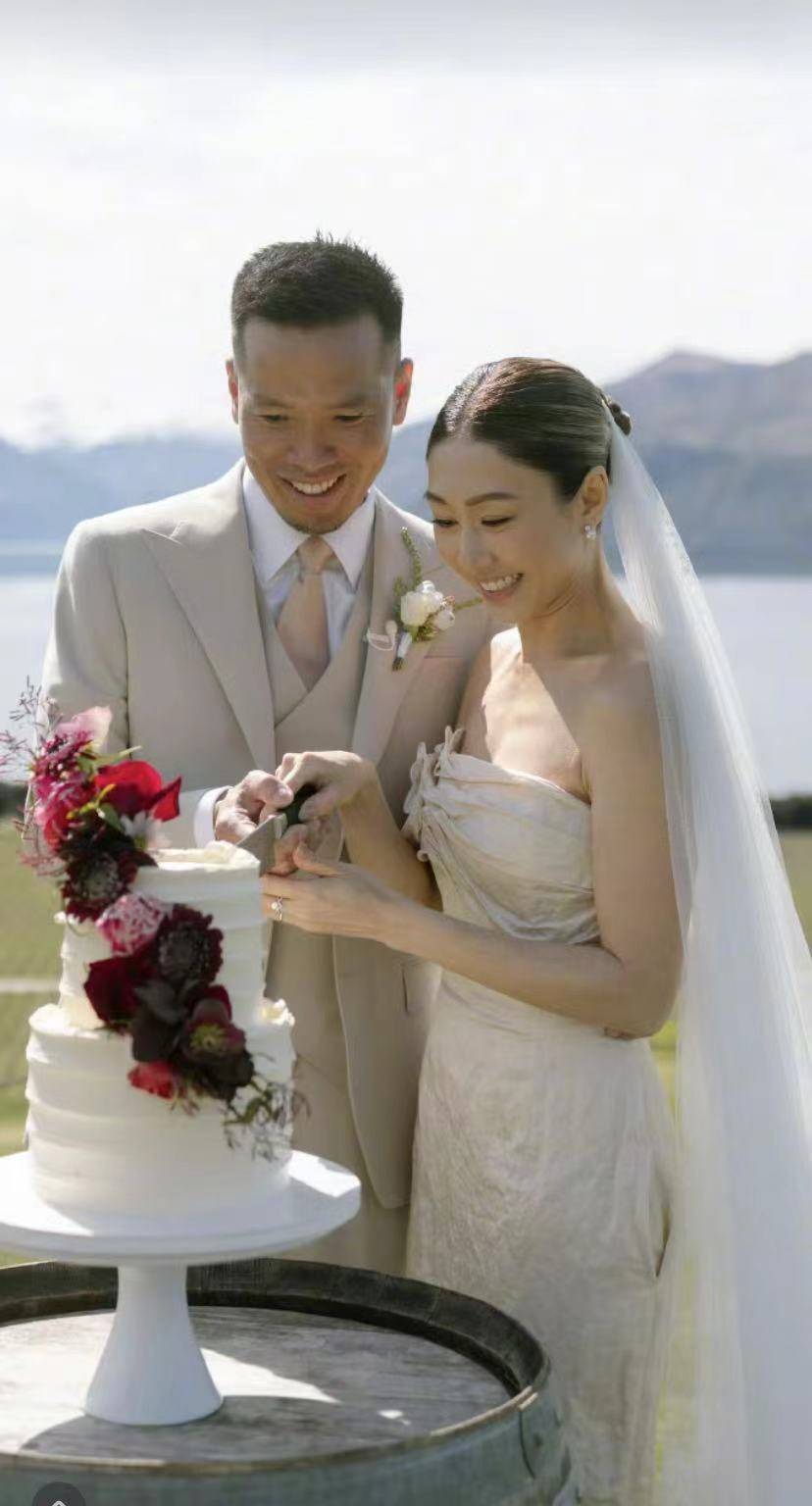 婚礼实际举行时间是10月3日,在新西兰举行,从婚纱照可见仪式在自然风光中举行,风格简约温馨又浪漫。胡定欣身穿露肩白纱,与丈夫牵手对望,切蛋糕,充满诗情画意,最美的选择,就是和相爱的人在美丽的风景中结为夫妻,白头偕老。