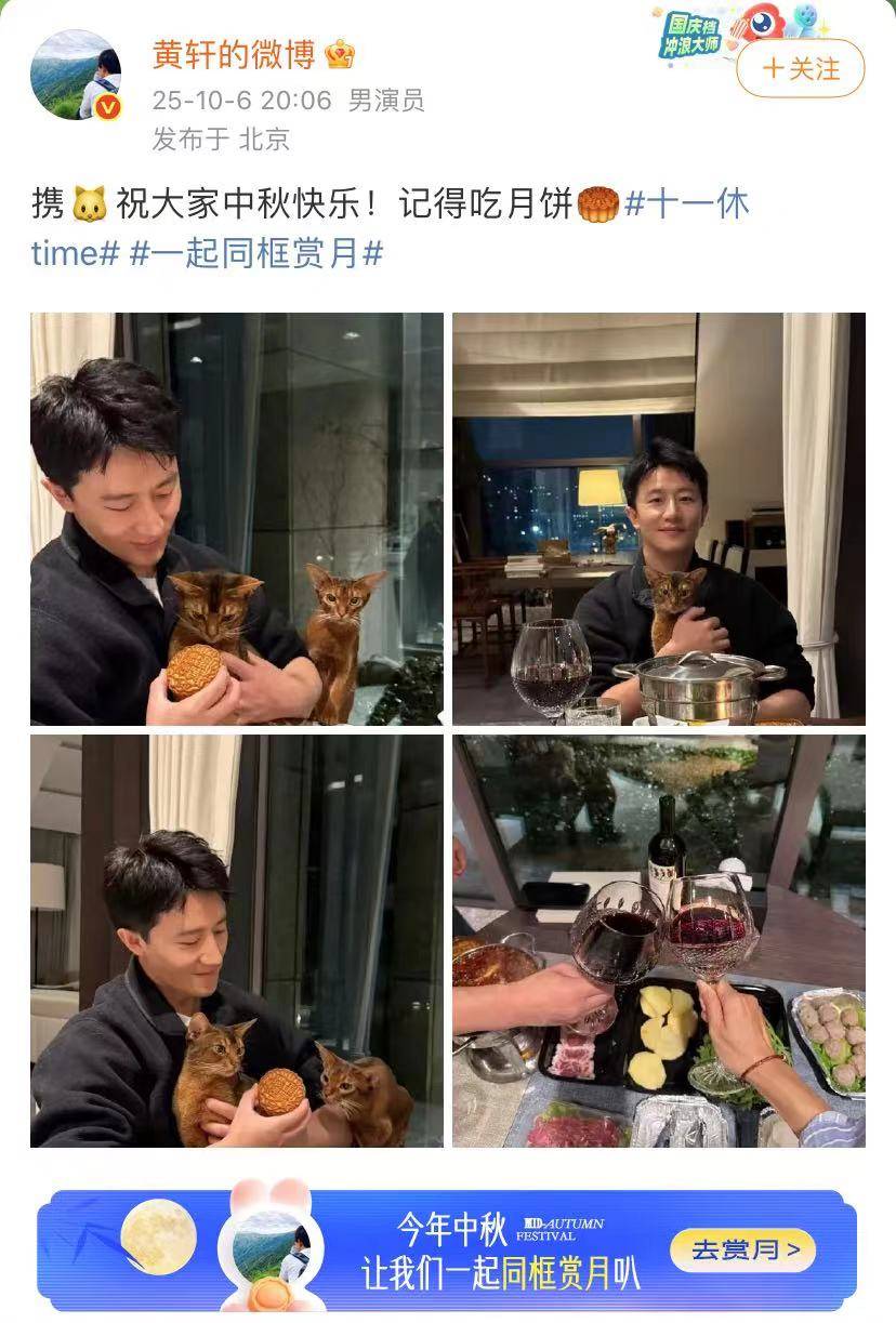 时值中秋佳节演员黄轩晒出一组照片,虽然没有看到女友的正面照,但似乎女友就在身边。