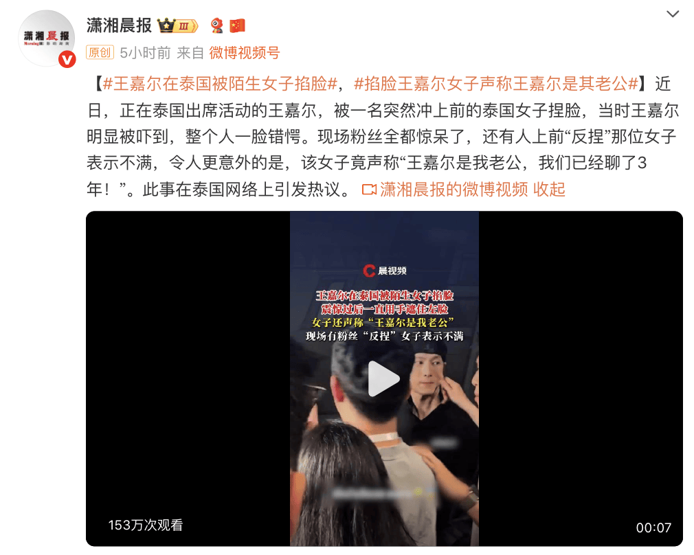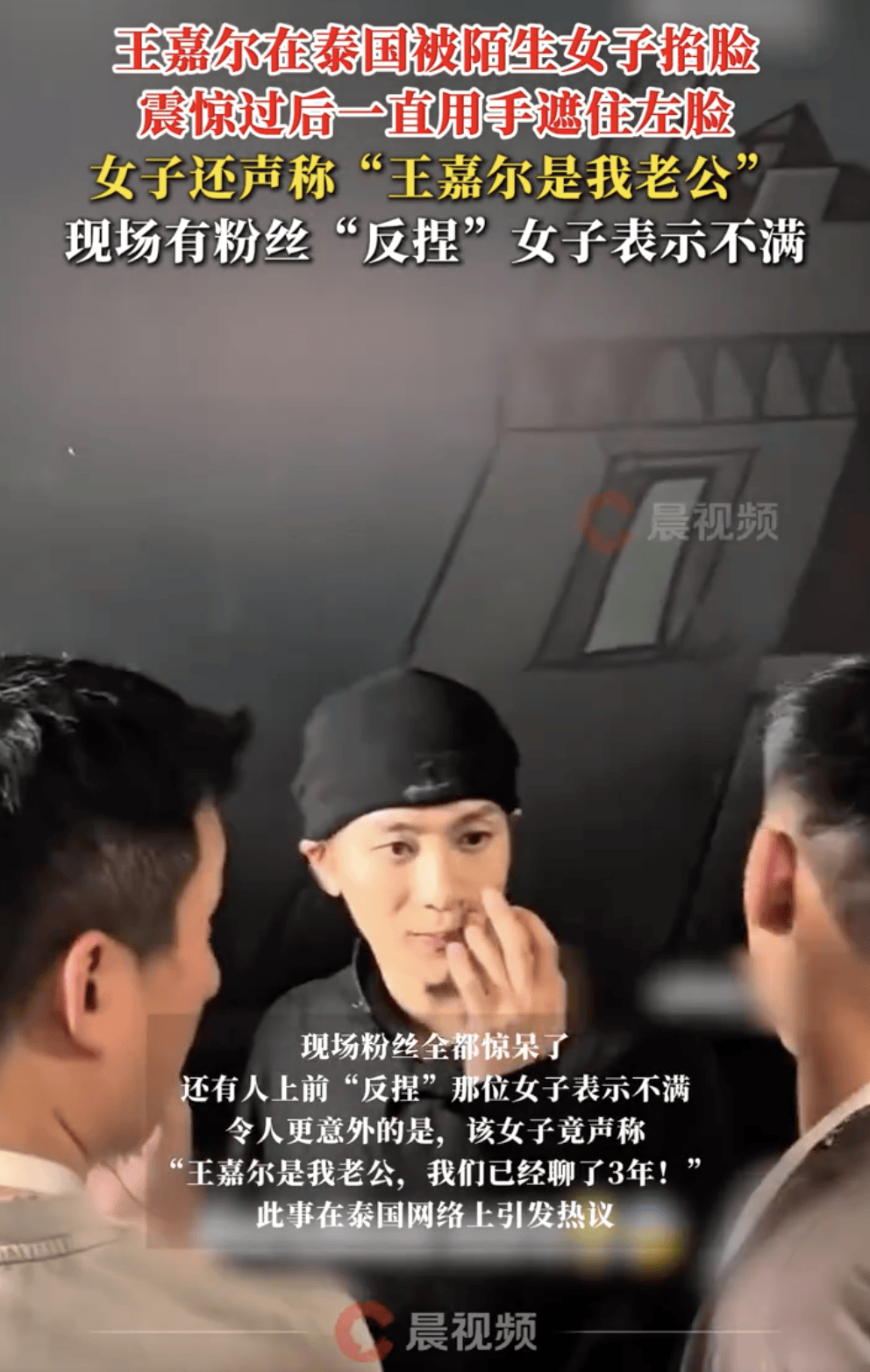 近日,正在泰国出席活动的王嘉尔,被一名突然冲上前的泰国女子捏脸,当时王嘉尔明显被吓到,整个人一脸错愕。现场粉丝全都惊呆了,还有人上前“反捏”那位女子表示不满,令人更意外的是,该女子竟声称“王嘉尔是我老公,我们已经聊了3年”。此事在泰国网络上引发热议。