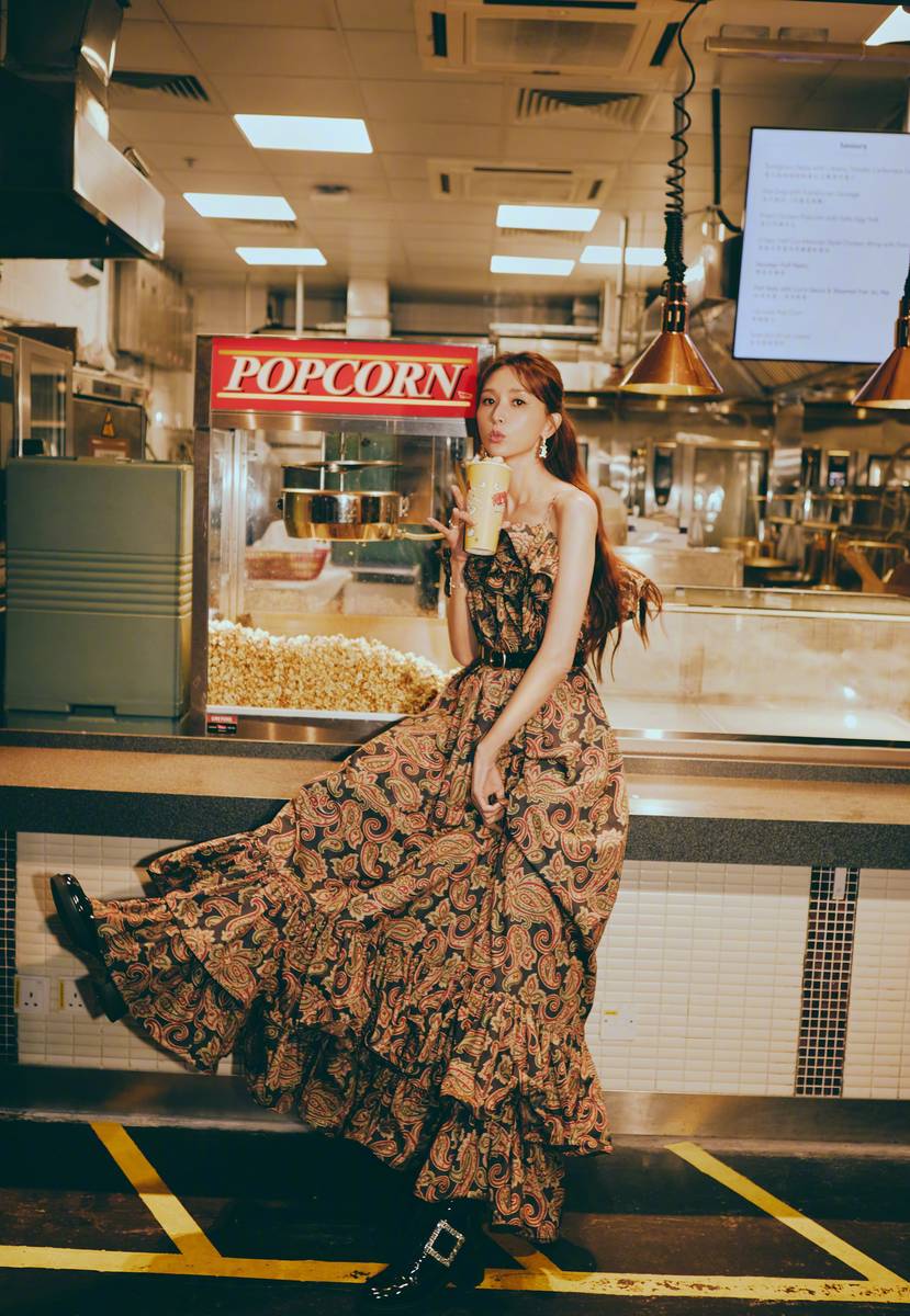 最具巧思的当属拍摄场景的选择 —— 背景是一台复古款式的银色爆米花机,机身带着淡淡的做旧痕迹,机身上印着 “Fresh Popcorn” 的红色字样,旁边还摆放着一个装满爆米花的玻璃罐,金黄的爆米花与林志玲的花纹长裙形成鲜明又和谐的色彩对比。照片中,林志玲侧身站在爆米花机旁,右手轻托一只透明高脚杯,杯中盛着浅粉色的饮品,杯口点缀着一片薄荷叶;左手则轻轻搭在爆米花机的手柄上,身体微微前倾,嘴角上扬露出温柔笑容,眼神明亮如星,仿佛刚接过一杯饮品,正准备享受片刻的惬意时光。