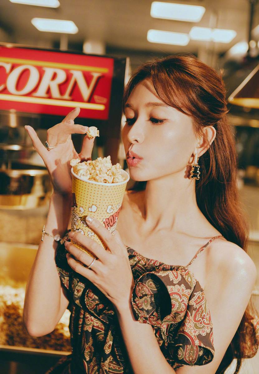 另一张照片中,她微微低头,目光落在手中的酒杯上,长发自然垂落,遮住部分侧脸,爆米花机的灯光在她身上投下柔和的光影,画面既有复古画报的质感,又不失生活气息;还有一张抓拍角度的照片,她似乎正准备拿起玻璃罐中的爆米花,手指轻轻搭在罐口,姿态随性自然,完全没有刻意摆拍的僵硬感,俏皮中透着灵动。