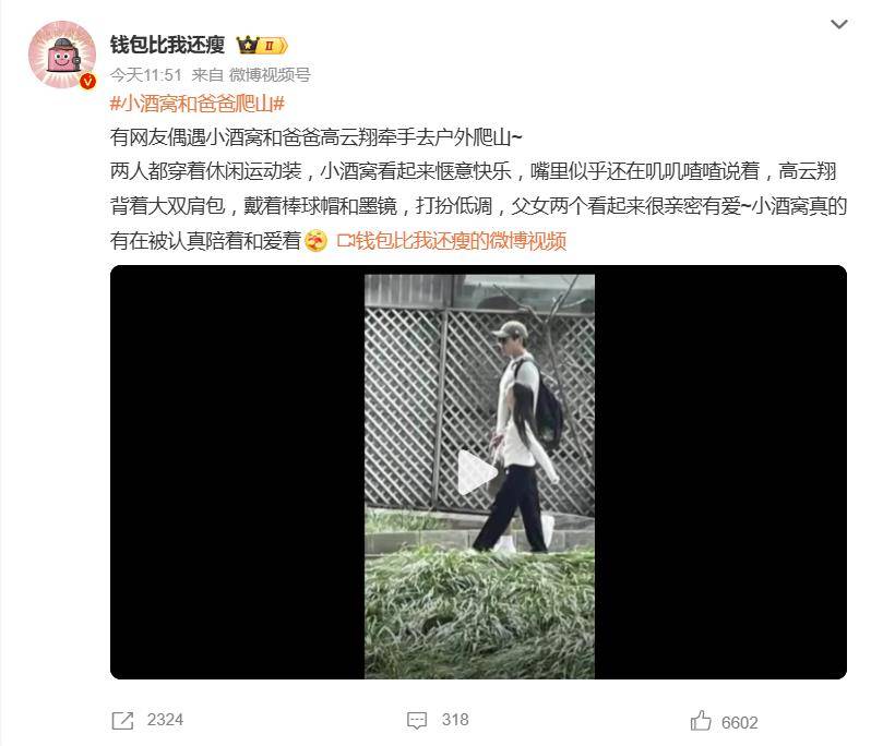 10月10日,有网友爆料,在户外巧遇高云翔带着女儿小酒窝一起爬山。画面里,小酒窝一身休闲运动装,全程蹦蹦跳跳、叽叽喳喳说个不停,神情那叫一个快乐放松;一旁的高云翔则背着大大的双肩包,棒球帽加墨镜遮面,打扮相当低调。他弯腰为女儿整理帽子时,动作温柔又专注——父女俩牵手同行的亲密模样,任谁看了都得说一句:小酒窝这孩子,是真在被认真陪着、爱着的。