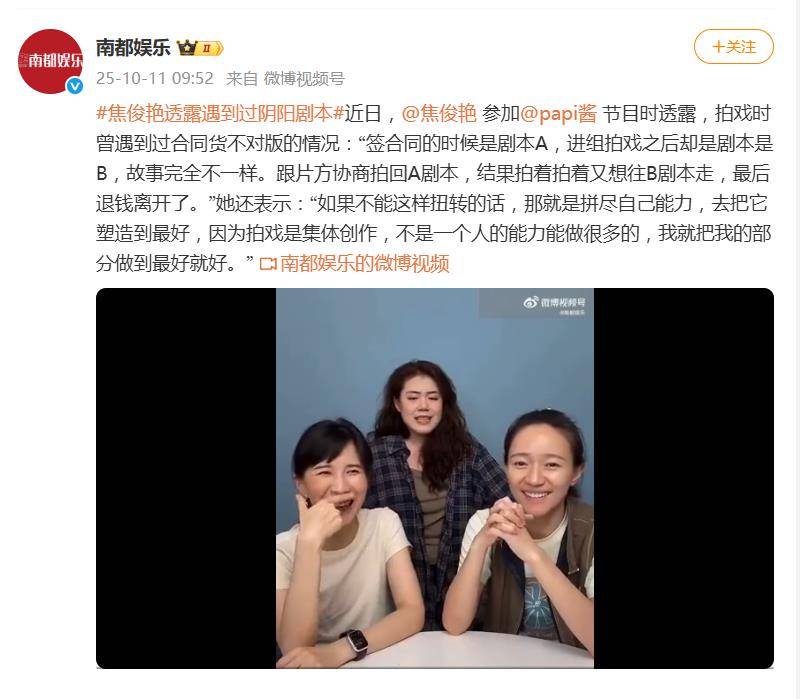 10月11日,有媒体报道,演员焦俊艳在节目中自曝拍摄经历,直接捅破了“阴阳剧本”这层窗户纸——签合同时敲定的是剧本A,进组后竟被偷换成剧本B,故事彻底变样。协商无果后,她直接选择退钱、退组,用行动硬刚行业乱象。