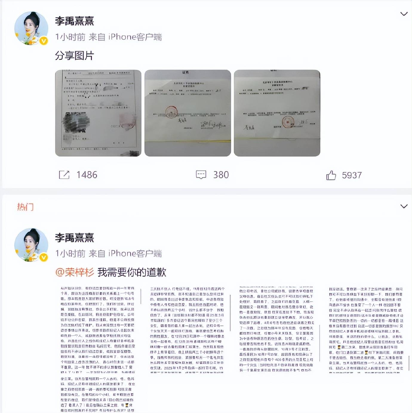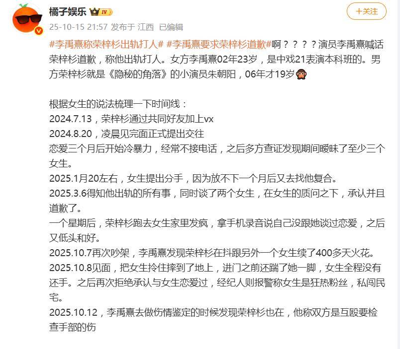 一则实名指控长文,让19岁的“朱朝阳”扮演者荣梓杉瞬间卷入出轨、冷暴力乃至肢体冲突的舆论漩涡。10月15日深夜,中央戏剧学院毕业生李禹熹通过微博详细陈述了她与这位童星师弟从相恋到决裂的全过程,并晒出诊断书、立案回执等证据,直指对方“出轨成性”“动手打人”,要求其公开道歉。而荣梓杉方面,截至目前仍保持沉默。