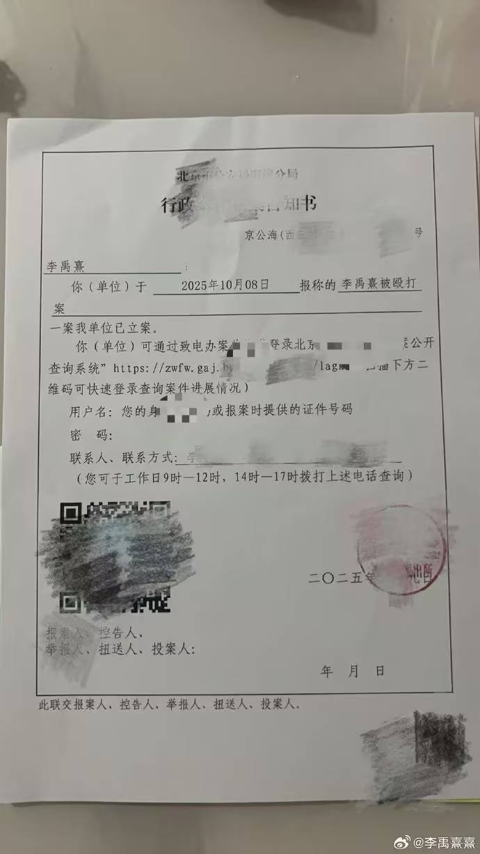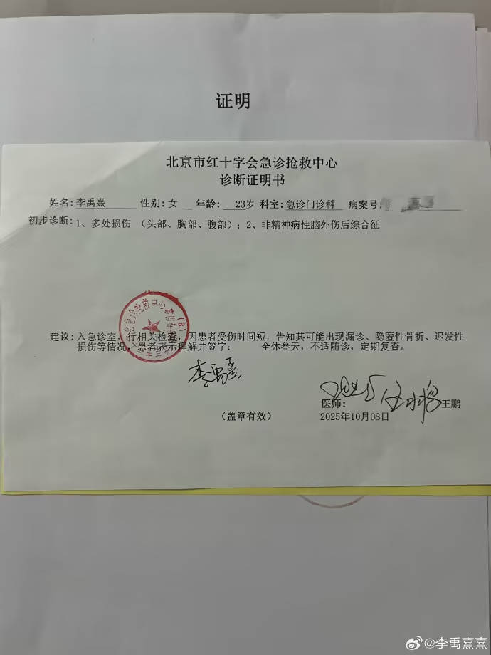 10月8日,李禹熹前往荣梓杉住所试图沟通,却遭遇了更激烈的场面。她描述,对方“二话没说就给我拎住摔倒在地,摔了我两次,我头和肩直接磕地上……进门前还踹了我一脚”,并强调自己全程未还手。事发后,她立即报警并验伤,诊断书显示其头部、胸部、腹部多处损伤,并伴有非精神病性脑外伤后综合征,需全休三天。