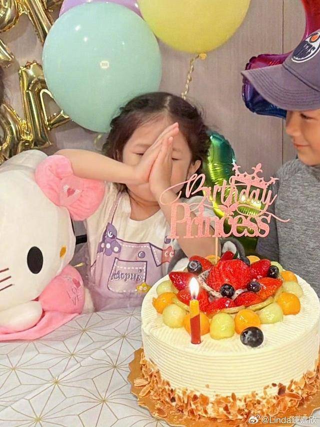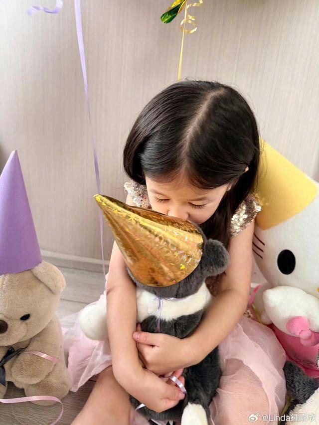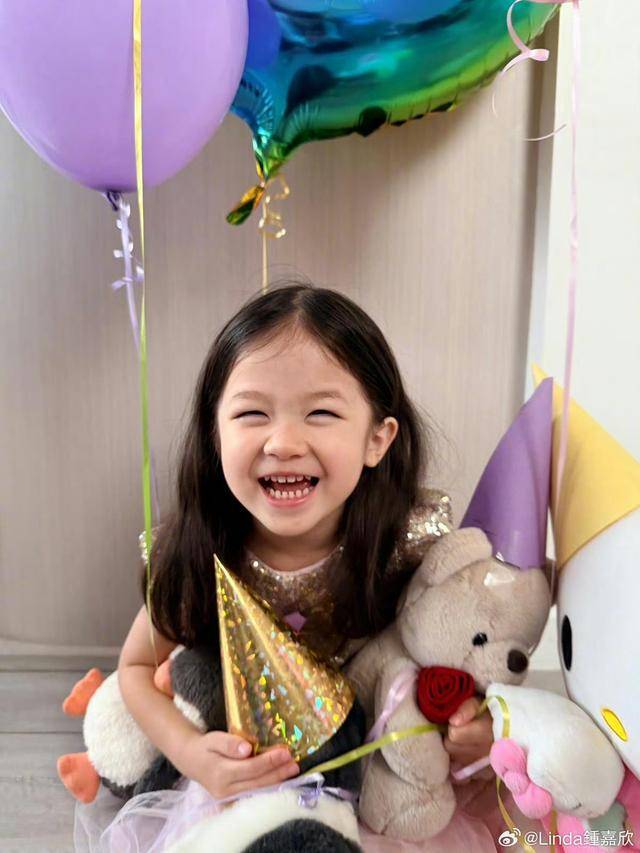 钟嘉欣的女儿作为小寿星,她当天也是很开心,留着一头长发的她将头发披散下来,看起来很乖巧,她笑起来的时候眼睛几乎眯成了一条缝,五官也是很立体,和爸爸极为相像。