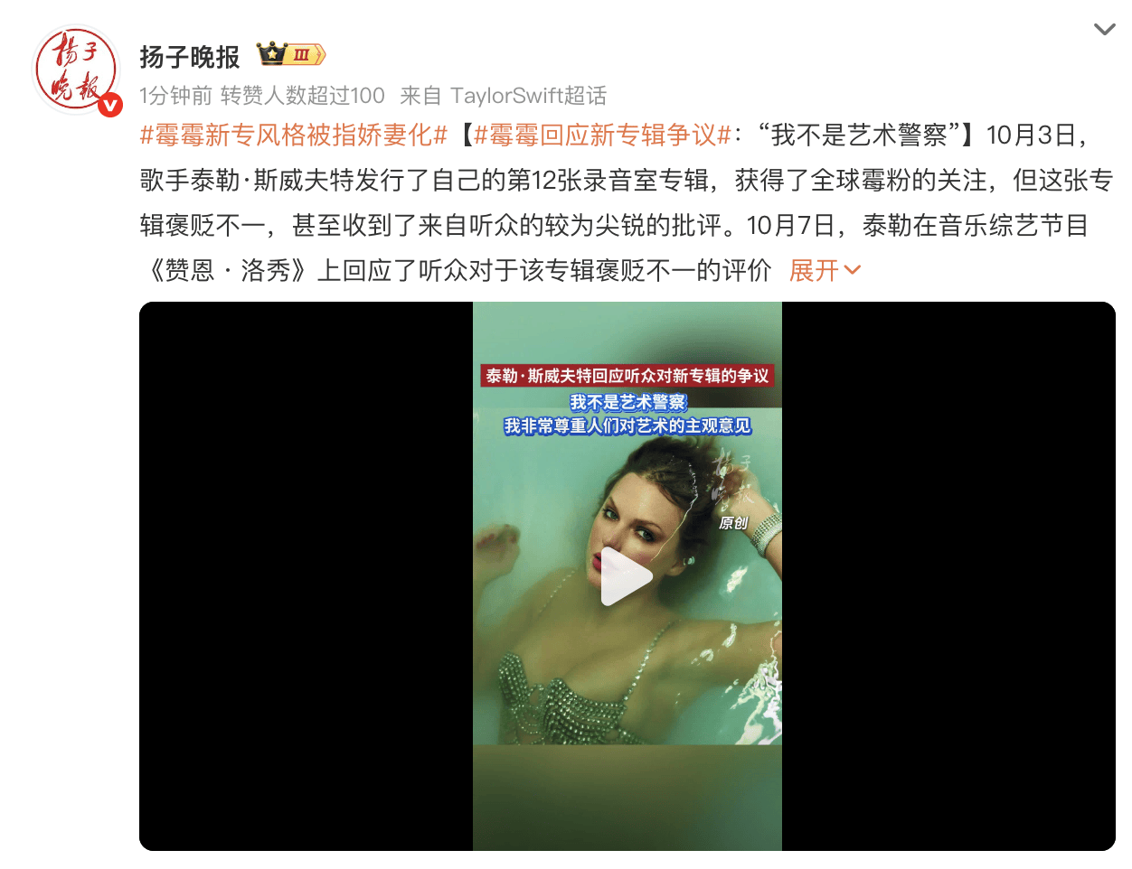 10月3日,歌手泰勒·斯威夫特发行了自己的第12张录音室专辑,获得了全球霉粉的关注,但这张专辑褒贬不一,甚至收到了来自听众的较为尖锐的批评。10月7日,泰勒在音乐综艺节目《赞恩・洛秀》上回应了听众对于该专辑褒贬不一的评价。