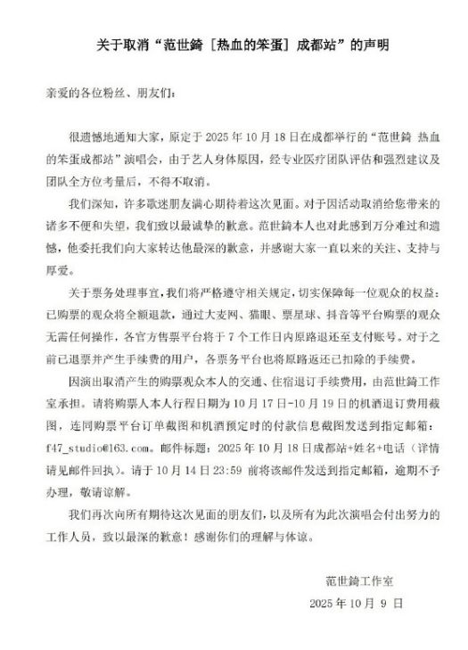 范世錡工作室发文称:“很遗憾地通知大家,原定于2025年10月18日在成都举行的“范世錡 热血的笨蛋成都站”演唱会,由于艺人身体原因,经专业医疗团队评估和强烈建议及团队全方位考量后,不得不取消。